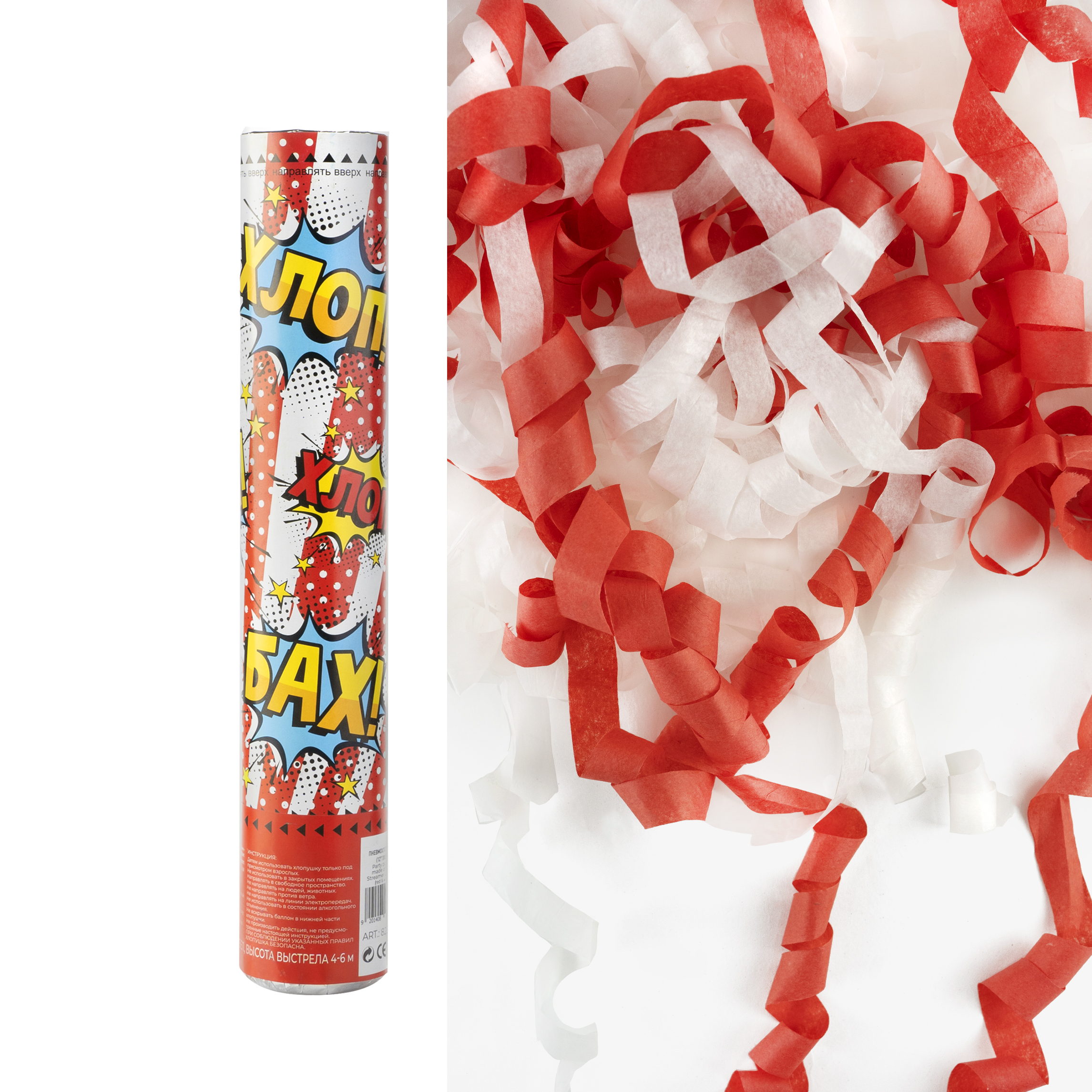 —Пневмохлопушка (12;30 см), Цирк, Яркий праздник, Серпантин тишью, Красный;Белый, 823156
