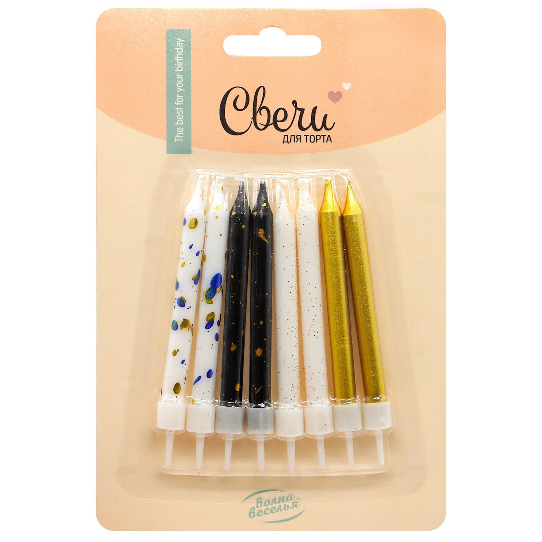 Свечи Модный Микс, Ассорти. Металлик, с блестками. 0,7х7 + 1,1 см, (8 шт;уп), с держателем, 803048